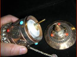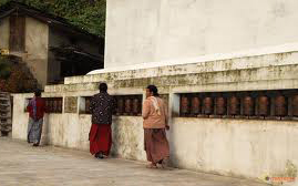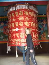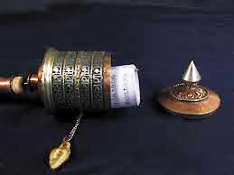 bouddhisme. Le moulin à prières traditionnel est constitué d'un cylindre rempli de mantras et pouvant tourner librement autour d'un axe. Selon les croyances associées à cet objet, actionner un tel moulin a la même valeur spirituelle que de réciter la prière du mantra, la prière étant censée se répandre ainsi dans les airs comme si elle était prononcée. Une masselote placée au bout d'une chaînette crée un 'balourd' et permet d'entretenir la rotation sans trop de peine Les moulins souvent disposés en longues séries sont mis en mouvement l'un après l'autre par le fidèle qui passe devant eux. Le fidèle déplace les moulins avec sa main droite. Et le moulin doit être tourné dans le sens des aiguilles d'une montre, afin que le mantra soit lu dans le sens où il a été écrit. ( Avant de démonter votre moulin vérifiez dans quel sens est placé le mantra, pour ne pas risquer de choquer un ami bouddhiste !) Il existe des moulins de très grande taille comme le montrent deux photos à gauche ! |